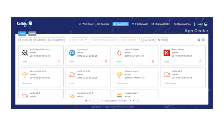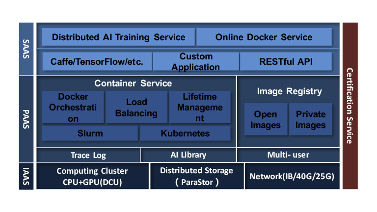 曙光人工智能服務平臺SothisAI 系列產品極大的降低了用戶切入深度學習領域的經濟成本和技術成本,提供一套容器化的集群調度以及深度學習私有云服務方案。SothisAI 采用Slurm、K8S雙調度引擎融合容器彈性擴展技術的方式,實現了資源的動態高效調度,應用的快速分發,和進程級隔離。支持多種編譯環境及常見深度學習框架,如Caffe、TensorFlow、PyTorch等。提供了豐富的數據集和典型網絡模型,同時支持內容分享和應用發布功能,協助構建平臺微生態。最終幫助用戶將更多的精力聚焦至垂直應用的開發和優化。SothisAI平臺目前已在多所高校、研究中心部署使用。